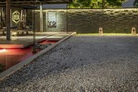 this is an outdoor area with concrete walls and a gravel driveway and a red lighting shines down