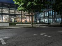 This stock photo features an empty road surrounded by trees and bushes, with a glass building in the background. The city of Berlin, Germany, comes alive at night with its modern architecture and artificial light. The road surface is made of asphalt, creating a smooth path for urban dwellers to traverse. The windows of the buildings glow with the warm light of cafes, restaurants, and residential areas. The vibrant city life and urban design create a captivating scene. The trees and vegetation provide a touch of nature in the midst of the bustling city. This image captures the essence of Berlin's contemporary architecture and urban charm, perfect for showcasing cityscapes and urban lifestyles.