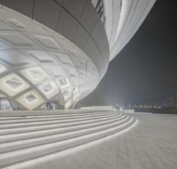 This stock photo features a captivating night time scene in the city. The image showcases an enormous building with impressive modern architecture, characterized by its lit up windows and large round ceilings. The steps leading up to the building add depth to the composition. The urban setting is beautifully illuminated by artificial light, accentuating the futuristic design. The clear sky in the background complements the overall aesthetic, making it a perfect representation of urban art and architecture. This photograph captures the essence of a contemporary plaza or museum, and it could be an ideal choice for projects related to architecture, design, or urban landscapes.