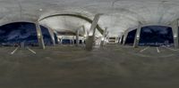A circular fish-eye lens captures the stunning night view of a building in Miami Beach, Florida. The artificial lights illuminate the concrete surface, creating an enchanting atmosphere. Straight down the road, a parking lot adds to the open space.