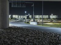 This is an image of a modern cityscape in Berlin, Germany. The photo captures the vibrant night scene with its iconic architecture and illuminated roads. The modern architecture, bridges, and underpasses add to the urban atmosphere. The buildings are lined by trees and streetlights, creating a captivating view. The dark sky above adds a touch of mystery to the image. This photo represents the dynamic and contemporary city life in Berlin.