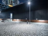 Night time in Berlin, Germany. The city comes alive with artificial lights illuminating the cobblestone streets and modern architecture. Industrial warehouses and urban design create a vibrant cityscape.