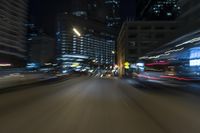 A nighttime view of Chicago's modern architecture. Concrete streets with streaks of light showcase the fast-paced city life. Street lights illuminate the straight roads, creating unique POV perspectives and captivating cityscapes.