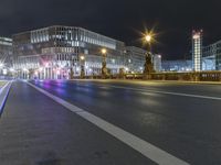 A car travels along an empty street at night in the city center of Berlin, Germany. The modern architecture and bright street lights create a vibrant atmosphere. The urban design reflects the classic and contemporary architecture of Europe.