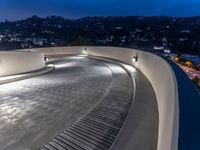 This stock photo captures the ambiance of a suburban neighborhood in Los Angeles at night. It features a white building with steps leading to an empty parking space on a well-lit city street. The concrete street and asphalt road curve gracefully under the glowing street lights, providing a visually appealing contrast to the dark night sky. The artificial light illuminates the surroundings, creating a vibrant atmosphere in the residential area. The image showcases an empty parking space on a concrete street, emphasizing the calm and peacefulness of the scene.