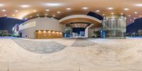 A modern architecture marvel in the heart of Shanghai, China. This community center features an indoor skate park with well-lit skating rinks and steps. The vibrant city life comes alive at night in this urban oasis.