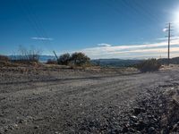 A rural off-road track in Los Angeles, California. The rugged landscape of mountains and dirt roads contrast against the clear skyline. Sun visible on a sunny day, with contrails in the clear sky.