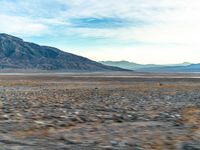 a desert with a lone yellow van on it's side, and large mountains in the background