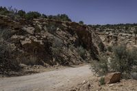 a dirt road is shown with rock formations in the background at a scenic distance and a few plants are growing