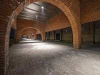 An archway leads to two rooms and an entranceway inside an old warehouse building with brick walls. The classic architecture and amber lighting create a nostalgic urban atmosphere. Located in China's art district, in cities like Shanghai, Suzhou, or Hangzhou.