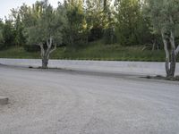 This stock photo features an olive tree standing in the middle of a road in Los Angeles, California, USA. The road is bordered by two concrete trees on either side, with a wall in the background. The image captures a scene of urban nature, where the tree stands out among the asphalt and concrete surroundings. The grass and vegetation on the roadside add a touch of green to the landscape. It's a peaceful day, with a clear sky overhead. The photo represents the combination of nature and infrastructure in a state park or recreational area.
