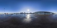 an empty parking lot is on the side of the road in the sunlight by a large glass building