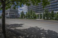 a paved street with buildings and trees on either side of a street with cars driving around