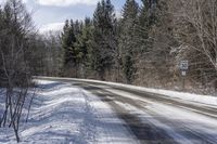 This is a beautiful image of a snow-covered road in Ontario, Canada. The road winds through a picturesque landscape, surrounded by forests and trees. The clear sky and fluffy clouds create a stunning backdrop. The winter season has covered everything in a blanket of snow, giving the scene a serene and peaceful feel. The road surface and vegetation are lightly dusted with snow, highlighting the winter wonderland atmosphere. This photo captures the natural beauty of Ontario in winter, showcasing the stunning landscapes and peacefulness of the season.