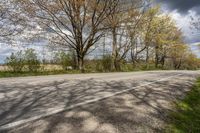 An empty country road in Ontario, Canada, surrounded by lush vegetation. The road surface is asphalt, leading to a rural landscape with trees and a clear blue sky.