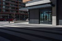 a brick building next to an empty walkway in front of a sidewalk with cars driving by