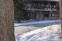 A snow-covered road in rural Ontario surrounded by residential buildings and elevated trees. The clear sky contrasts with the freezing winter conditions. A high view showcases the architectural beauty of the homes.
