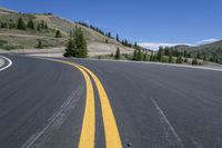 This stock photo captures the stunning beauty of Colorado's Cottonwood Pass. The open road, with a yellow stripe on the edge, is surrounded by lush vegetation, including trees and snow-capped mountains in the distance. The sky is clear, allowing for a breathtaking view of the landscape. The straight road surface, made of smooth asphalt, leads to Crested Butte, a charming town in the heart of Colorado, USA. It's a perfect representation of a scenic road trip through the majestic mountains and nature of Colorado.