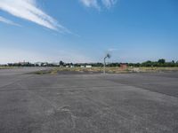 This is an image of an open space in Berlin, Germany. The clear sky above contrasts with the urban landscape below. The city life can be seen with the presence of a basketball court and stadium in the distance. The asphalt road surface cuts through the grassy land lot, with trees and vegetation lining the thoroughfare. This photo captures the urban design and vegetation of Berlin, depicting a typical day in the city. The image showcases the plain landscape with the airport and airfield in the background.