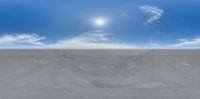 A vast open space under a bright skydome, featuring endless salt flats and the sun casting sunshine across the desert landscape.