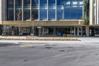This is an image of an empty street in the business district of Ottawa, Canada. The road surface is made of asphalt and tar, giving it a dark and smooth appearance. The building in the photo features modern architecture with large glass windows, suggesting a hotel or store. The urban design of the city is evident with the curbs and sidewalks in the foreground. This photo represents the urban and business life of Ottawa, showcasing its architecture and vibrant atmosphere.