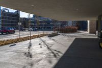 A modern office building in Ottawa's business district, set against a clear sky. The concrete surface of the road and hard shadows create a striking urban design. City life in Canada at its finest.