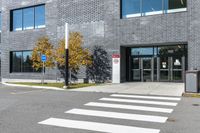This image captures a small city street in Ottawa, Canada. In the foreground, there is a white crosswalk surrounded by vegetation and a road surface made of asphalt. A building can be seen behind the crosswalk, with a car parked in the driveway without doors. The scene depicts a typical day in the urban landscape of Ottawa's business district. The urban design includes street lights, curbs, and office buildings. This photo represents the bustling city life and the intersection between pedestrians and vehicles in the urban environment of Ottawa.