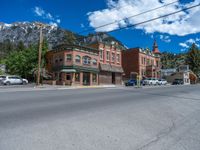 A scenic road in Ouray, Colorado surrounded by mountains. The quaint suburban village offers various shopping options with storefronts against a clear sky.