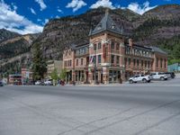 A road in the suburban village of Ouray, Colorado. Cloudy day adds atmosphere to the scene. Residential area with charming storefronts and shops. A picturesque slice of small-town USA.