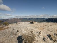 This is a scenic landscape image of a person sitting on top of a rock formation, overlooking a valley. The open space and rugged terrain provide a stunning view of the horizon. The plain bedrock and vegetation add to the natural beauty of the setting. The cloudy sky creates a dramatic backdrop for this serene and picturesque scene. This photo captures the essence of a day in nature, where one can appreciate the beauty of the landscape and feel a sense of peace and tranquility.
