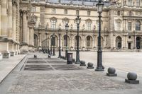 This image captures the classic architecture and urban design in Paris, France. The gloomy grey sky casts shadows on the town square, creating a moody atmosphere. The city life is alive with people walking along the road surface, surrounded by buildings with beautiful facades. The plaza is lined with columns and features an elegant arcade. The public space, courtyard, and curbs add to the charm of the architecture. This photo showcases the timeless beauty of Paris, and the intricate design of the city's buildings and public spaces.