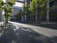 Paved street in Berlin, Germany, surrounded by modern architecture. The vibrant city life is captured in the sunny atmosphere, casting strong shadows. A bustling metropolitan area with a mix of residential and business districts.