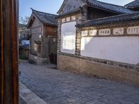A picturesque old town in Yunnan, China. Cobblestone paths wind through the historic architecture and classic residential buildings. Clear skies highlight the beautiful roofs and doors of this charming village.