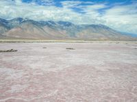 A pink lake in the California desert surrounded by open space and mountains in the background. The salt surface adds an ethereal touch to the landscape. A serene day in the vastness of the USA.
