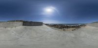 a skate park with the sun in the background and a person riding a skateboard