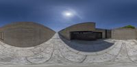 a panoramic looking image of a skateboarder riding on a rail over cement ramps
