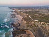 Aerial view of Portugal's coastal landscape featuring a beach under a clear sky. Elevated perspective captures the ocean's expansive surface. Experience the serene beauty of Portugal from a high position.
