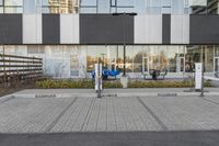 This image captures a view of a street in Toronto, Canada during dawn. The modern architecture of the buildings in the business district stands out against the clear sky. The street is lined with parking meters and electric car charging spaces, reflecting the city's commitment to sustainability. The low-rise residential area in the background contrasts with the urban design of the city. In the foreground, the road surface and flooring lead to the loading dock of a warehouse. This photo showcases the mix of urban and suburban elements in Toronto's metropolitan area.