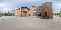 A classic architecture building in Berlin, Germany. The facade is adorned with graffiti art, showcasing the city's urban culture. The entrance leads to a public center, surrounded by cobblestone walkways and lined with trees. A snapshot of Berlin's vibrant and diverse neighborhood.