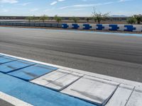 A race track in the USA, with asphalt roads and curves. Clouds dot the clear daytime sky as cars race along the road. A thrilling day of racing awaits.