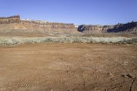This stock photo depicts a stunning landscape in Davis Canyon, located in the beautiful state of Utah, USA. In the foreground, you can see a dry area with dirt, some grass, and a few rocks. The dominant feature of the scene is the majestic red rock formation that forms the canyon walls. The open space is filled with breathtaking views of the mountain landforms and the clear sky above. The rocky terrain and bedrock create a unique and mesmerizing environment, showcasing the diverse vegetation and plant community that thrives in this desert region. This image captures the essence of the captivating canyonlands, offering a glimpse into the natural beauty of Utah's desert landscape.