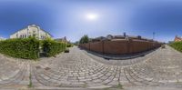 A picturesque street in Berlin, Germany. Classic architecture and cobblestone pavement give it a timeless charm. The clear sky highlights the symmetrical rows of residential buildings and their distinctive brick facades. A true landmark of urban design.
