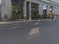 This is an image of a modern residential building in Berlin, Germany. The architecture of the building is sleek and contemporary, with large windows and a grey exterior. The busy city street with asphalt road and sidewalks can be seen in the foreground. An automobile and a bicycle are parked near the curb. The street is lined with various storefronts including a restaurant and a cafe. This photo captures the urban design and atmosphere of the city, showcasing the vibrant street life and European charm of Berlin.