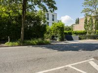 This is an image of a modern residential area in Hamburg, Germany. The picture shows a clear sky with the sun casting hard shadows on the road and houses. The architecture is modern and the road surface is made of asphalt. The neighborhood is surrounded by trees, creating a pleasant and green environment. This photo represents a typical day in Hamburg, showcasing the residential properties and public spaces that make it an attractive place to live. The image captures the contemporary and vibrant atmosphere of this European city in Germany.