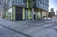 A modern architecture of a residential building in Toronto, Ontario. The glass facade and green walls blend harmoniously with the city's urban design. Clear skies reflect off the glass walls.