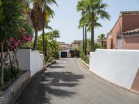 palm trees line the walkway down a street past a white wall and house with a red car parked on it