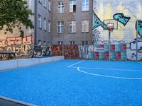 A vibrant and artistic scene in the heart of Berlin, Germany. Colorful graffiti adorns the walls of a urban courtyard as basketball hoop stands tall. The bustling city life comes alive against a backdrop of residential buildings and open spaces.