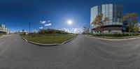 A wide-angle view of a road in Toronto, Canada. The modern residential building stands amidst lush greenery with several trees and a grassy lawn. Clear skies illuminate the scene, creating a serene city life ambiance.