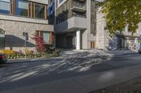 A modern residential building in Toronto, Canada. The clear autumn day showcases the sleek urban design with its clean lines and contemporary architecture. Trees and vegetation provide a natural contrast.