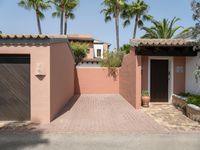This stock photo features an open entrance and garage on the patio of a home located in the charming neighborhood of Santa Ferez in Spain. The image captures a straight road with asphalt, lined with residential houses and surrounded by a clear blue sky in a sunny day. Santa Ferez is a picturesque residential area on the beautiful island of Mallorca in the Balearic Islands, located in Europe.